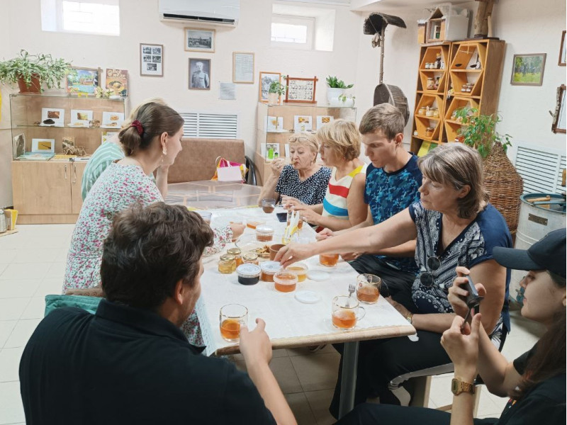 В музее царила по-настоящему теплая и уютная атмосфера. Воздух был наполнен тонким, сладким ароматом различных сортов меда, который переплетался с запахом свежеиспечённых яблок, создавая ощущение домашнего уюта. Посетители, увлеченные тихой и познавательной беседой о пчеловодстве, словно растворялись в этом мире, где каждая история о пчелах и их труде звучала как маленькое чудо. Внимание всех было сосредоточено на богатстве и многообразии меда, а рассказы о пчелах пробуждали искренний интерес и уважение к этим удивительным созданиям.